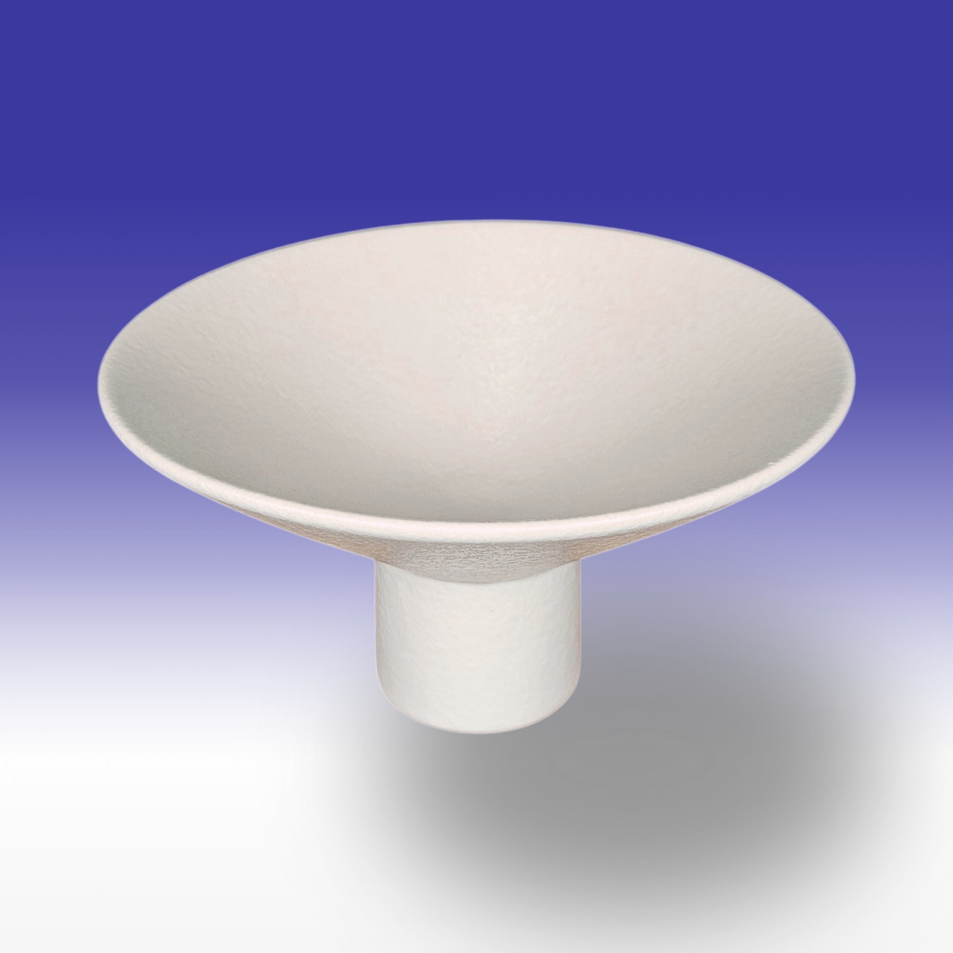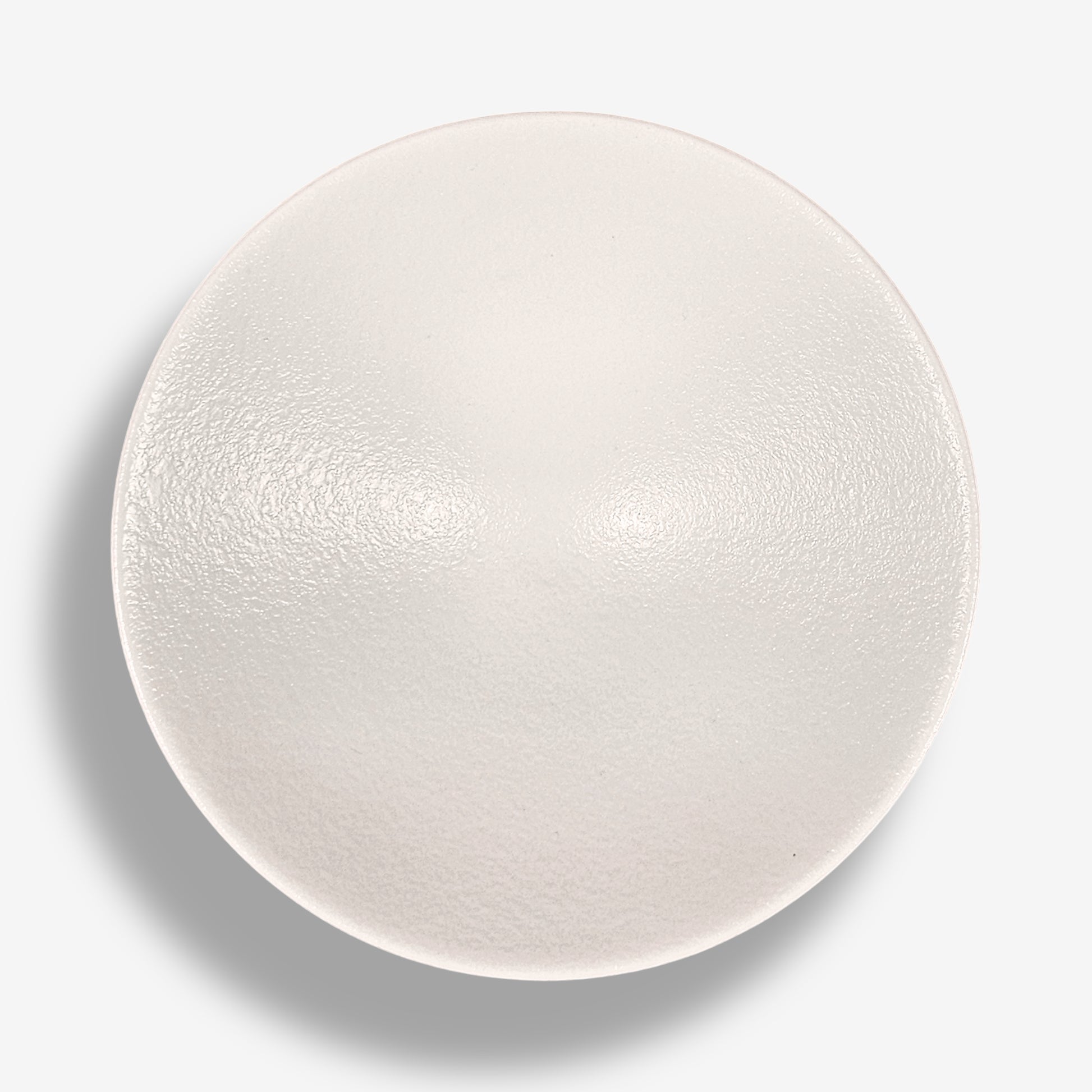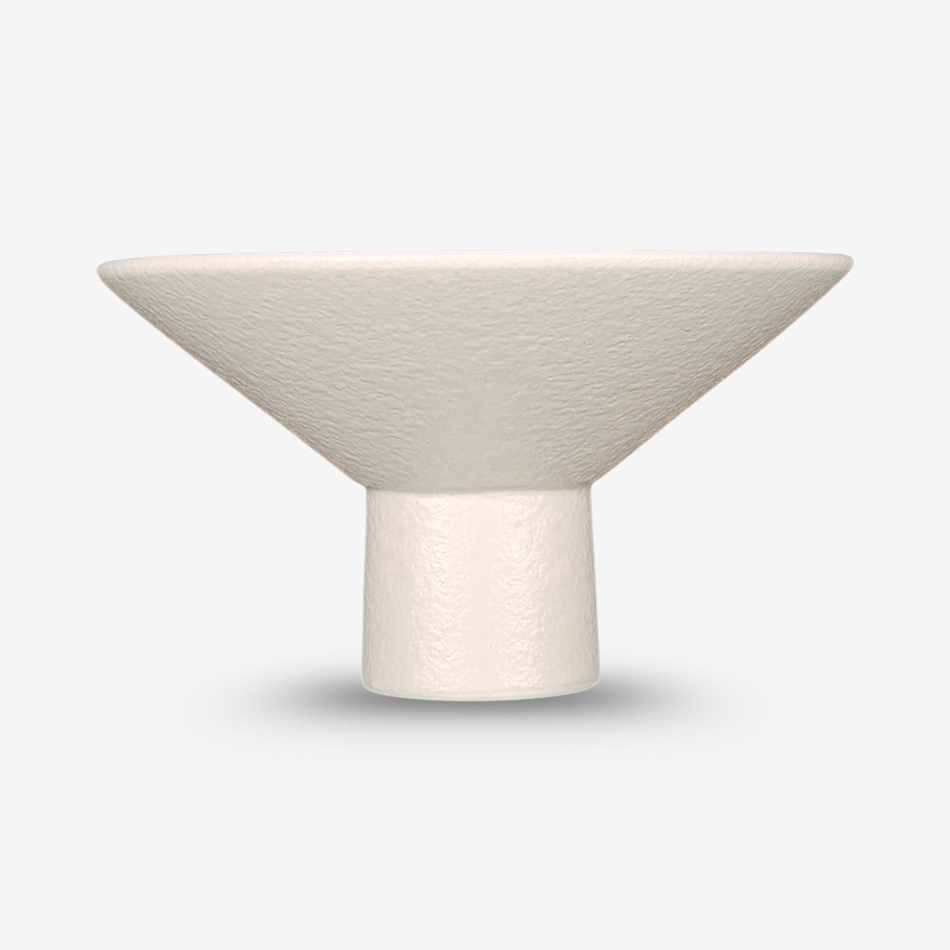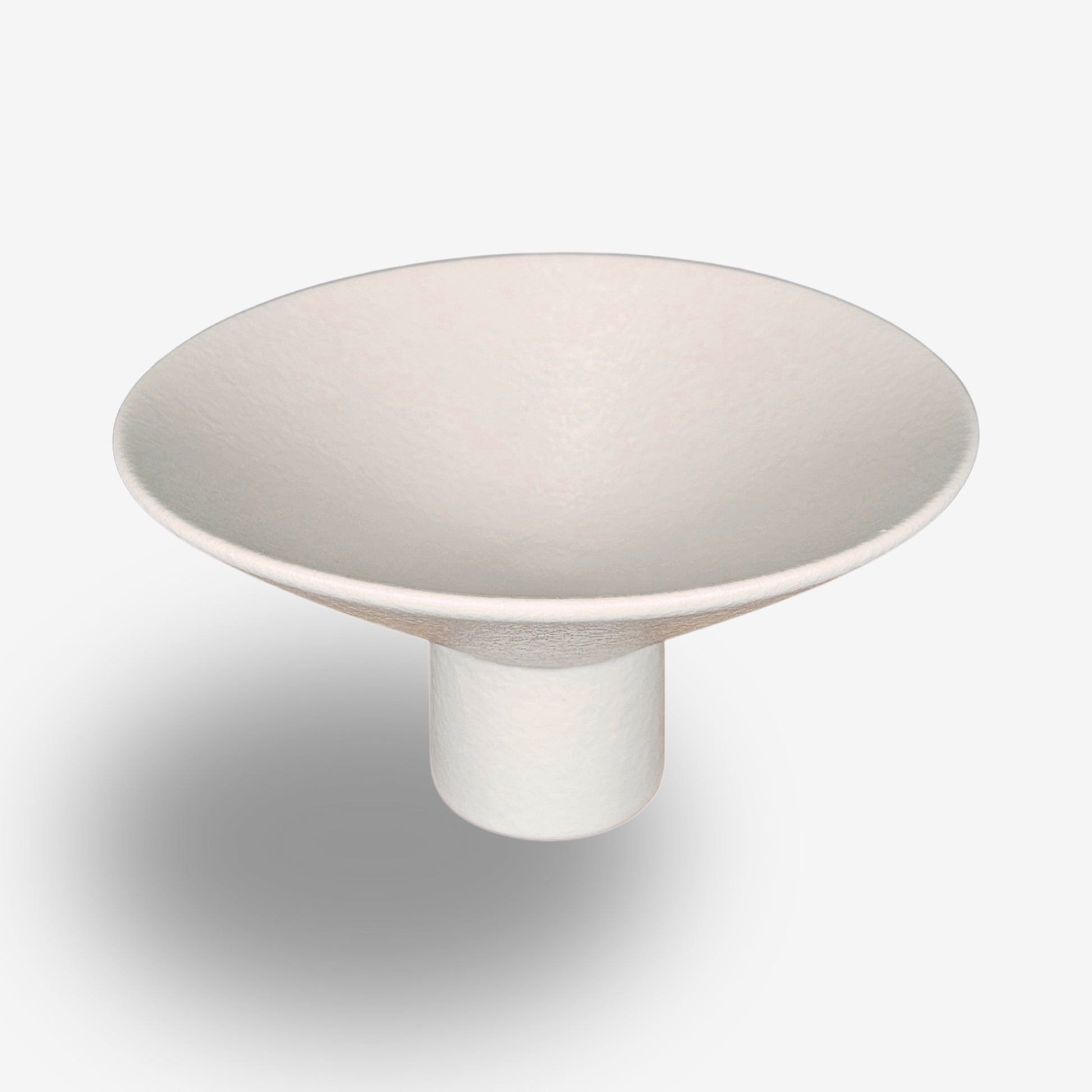 Poised on a batchim (받침)—a pedestal base that elevates the vessel—the Lunar Batchim Bowl turns food into a ceremony. The warm-white porcelain rises in a wide cone, its hand-textured exterior catching light like the surface of the moon, while the interior opens smooth and reflective. Lifted from the table, it masterfully plays with three-dimensional space and shadow, presenting fruit or tteok on an altar—an intentional stage where the food feels dignified and sacred. Fired at ultra-high temperature and handcrafted by artisans using premium Icheon porcelain, its impactful architectural presence is strengthened through the fullness of form. A statement of elevation in every sense, where food is honoured through height.